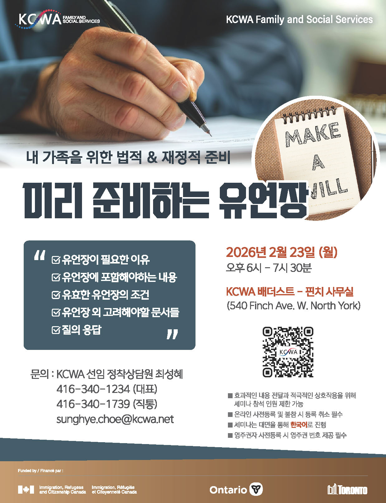 KCWA에서는 유언장의 필요성과 준비 방법을 안내하는 '미리 준비하는 유언장' 대면 세미나를 진행합니다.